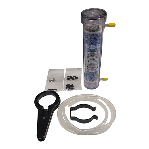 The drying tower is a molded-acrylic column with a water-vapor capacity of 50 g, height is 300 mm. It is safe for working pressures up to 90 psig and can regenerate by heating granules on a tray for one hour at 200 °C.