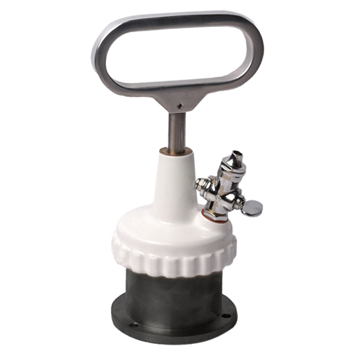 A plunger passes through the lid and is attached to a perforated metal worker plate. The top of the plunger has a sturdy handle for easy operation. Long-life seals prevent grease from extruding past the plunger during operation.