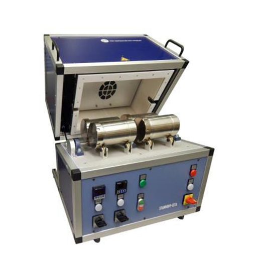 The unit allows up to four test cylinders to be used simultaneously. Each test cylinder contains a heavy roller and is loaded with a quantity of the sample grease. The test cylinder rests horizontally upon a set of driving and guide wheels which rotate the cylinder at 165 rev/min.